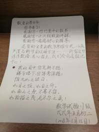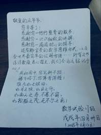 贺卡中,同学们亲切地称呼这两位教授为“丘爷爷”、“李爷爷”,一句“您辛苦了!”虽然只有短短的四个字,但最能体现出同学们真切的心和对他们饱含深情的敬意、感激。这张小小的贺卡里满载了这一年中的回忆,也表达了同学们对老师的衷心祝愿:每一次大课上老师用不同颜色的粉笔书写下的工整而又细致的板书;每一次习题课上老师悉心的指引和讲解、点评;每一次答疑时老师严肃认真的态度和耐心的辅导……其实,这一件件事我们都没有忘记,也永远不会忘记。我们只是把它们藏在心里,在心头默默赞颂着——“惟九如之颂曰:‘如月之恒,如日之升。如南山之寿,不骞不崩。如松柏之茂,无不尔之承!’”便是同学们发自肺腑地对老师的祝愿和感谢。“春蚕到死丝方尽,蜡炬成灰泪始干”,这是数试学子对您的赞许;“令公桃李满天下,何用堂前更种花”,这是人们对您的敬颂。三尺讲台,三寸舌,三寸笔,却撒下三千桃李;十年树木,十载风,十载雨,得以培养十万栋梁。