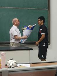 最后一次课后,几位班委代表2017级数学试验班全体同学将鲜花和贺卡分别赠予这两位德高望重的老教授,全班同学与二位老师合影留念。