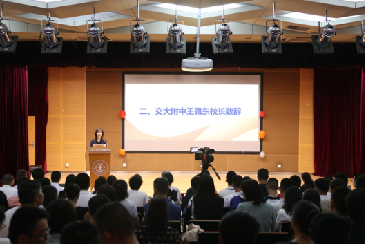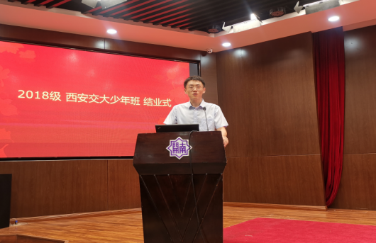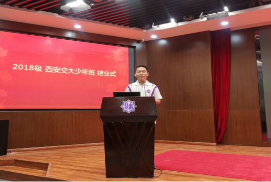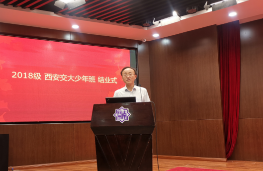 结业典礼在全场高唱雄壮的国歌声中正式开始,西安交通大学基础教育党委书记、西安交通大学附属中学王佩东校长首先向31名出色地完成了预科一年级学习任务,即将告别附中,开始人生新航程的少年班的同学们表示最热烈的祝贺。她充分肯定了少年班同学们一年来取得成绩,并对少年班学生们提出三点要求:第一,学会做人。欲做学问,先学会做人;热爱生活,要有坚毅的品质,这样的人才值得尊敬;第二,树立终生学习的目标,积极的探索新的知识;只有爱读书,多读书,坚持努力才能走出精彩的人生。第三,勇于担当。引用梁启超《少年中国说》激励少班学生,要为国家的繁荣富强奋起拼搏,要挑起个人、集体、祖国赋予我们的责任,努力做最好的自己。王佩东校长还为2018级少年班的同学赠送了精美的校徽。