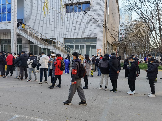 为迎接校外考生进校,钱学森书院党总支组织学生党员负责校门的引导工作。志愿者们凌晨6点就已全部到岗,负责维持排队间距,协助查验准考证、核酸检测报告等相关证明,积极服务考研学生。