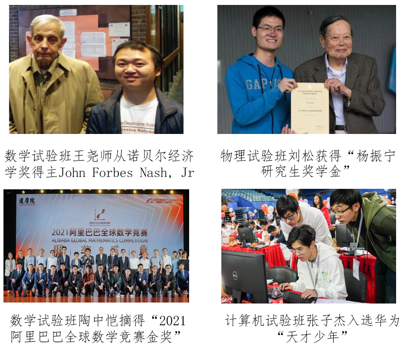 延续培养理念,改革培育成效显著。学校建立追踪机制,通过QQ群、邮件等多种方式关注毕业生成长。目前,试验班学生发表论文115篇,其中Nature 3篇,Science 2篇。部分毕业生离校后,继续师从世界顶级名师,收获各种荣誉。如:数学试验班2015届王尧就读于美国普林斯顿大学,师从诺贝尔经济学奖得主John Forbes Nash, Jr;物理试验班2014届刘松在香港中文大学就读期间获得“杨振宁研究生奖学金”;数学试验班2019届谢鹏程入选共青团中央“全国向上向善好青年——勤学上进好青年”(全国仅20名);数学试验班2020届陶中恺作为年龄最小的参赛选手,摘得2021阿里巴巴全球数学竞赛金奖;计算机试验班2020届张子杰、丁聪入选华为“天才少年”(全球仅录用3名本科生)。