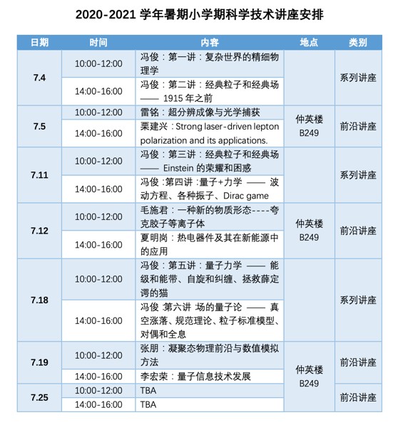 自拔尖项目开展伊始,学院成立“物理拔尖项目工作组”,将优秀本科生在日常专业学习之外能接触乃至进入前沿科研作为推动的重点工作之一。每年暑期小学期的前沿科学技术讲座系列(I-III)便是引导试验班学生进入科研的第一课。整个课程分为国内国外两部分: