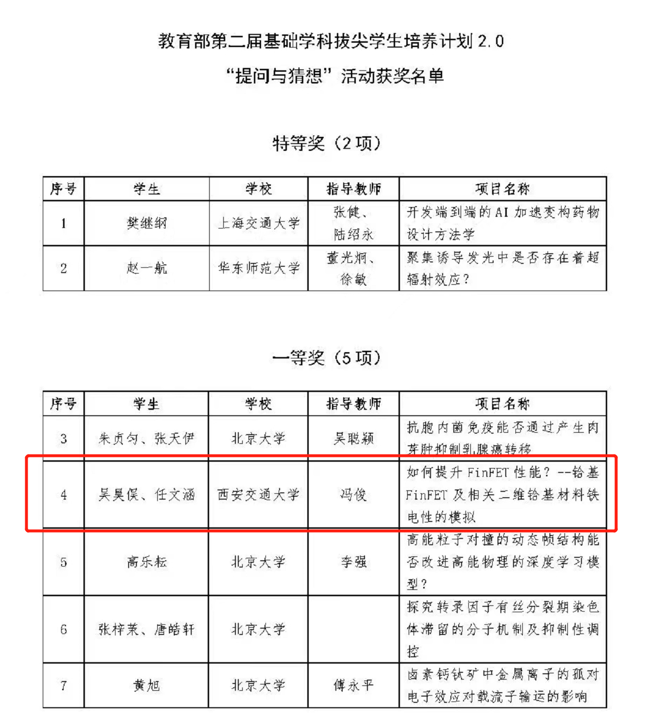 近日,由教育部高教司主办,拔尖计划2.0秘书组承办的第二届“提问与猜想”活动落幕。西安交大物理试验班大四学生吴昊俣、任文涵参赛的《铪基FinFET及相关二维铪基材料铁电性的模拟》项目荣获一等奖。