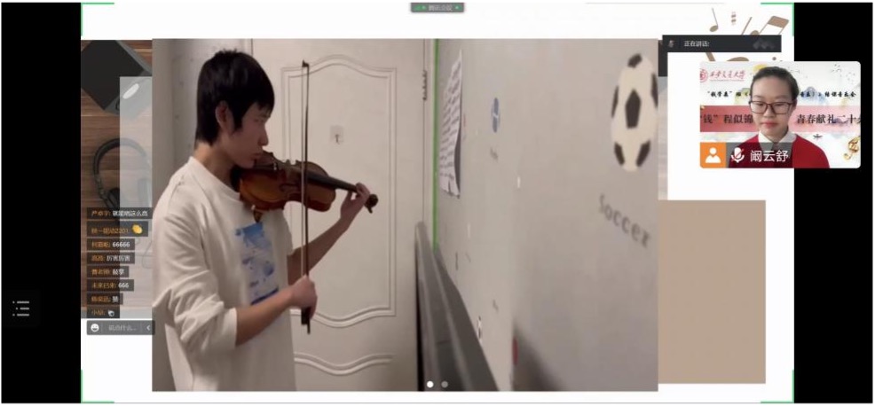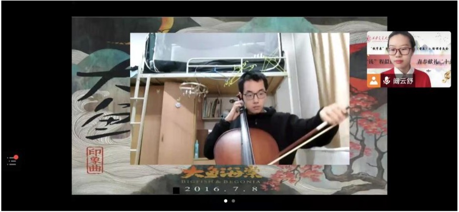 “云”音乐会由来自智造钱2201的阚云舒同学主持,她为线上音乐会的顺利举行做了很多准备工作。开场时,课程负责人曹耿献老师对同学们的付出和努力表示衷心感谢,她说:“正因为在疫情中大家“青春的热情”才能够点燃线上的“云”音乐会,《艺术欣赏与创作(音乐)》同学们的风采也才能呈现给所有的观众们。”