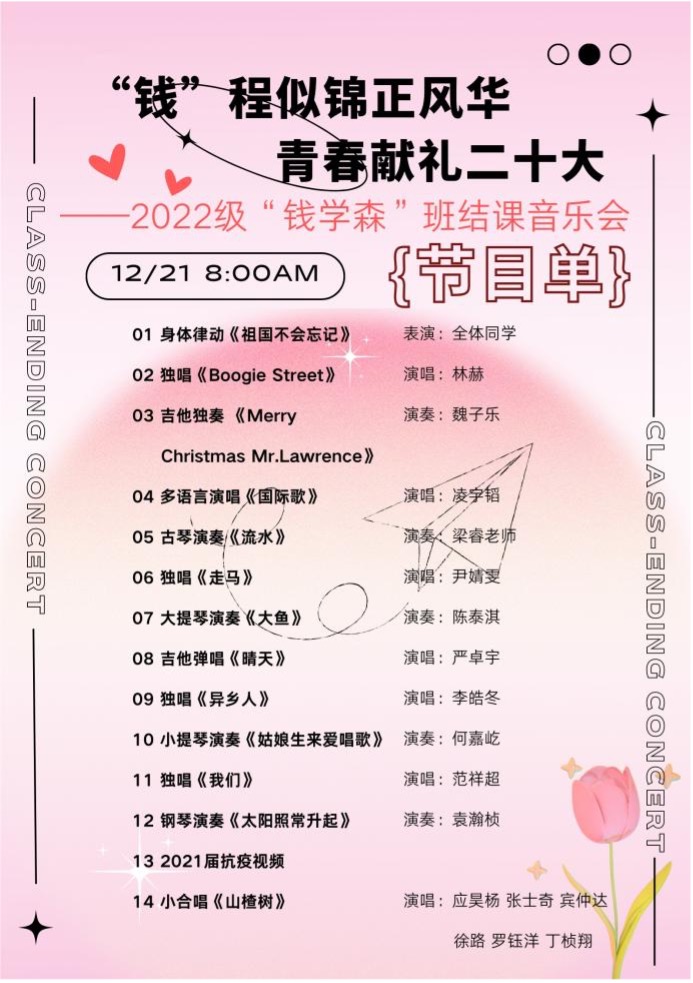 2022年就要过去了,同学们以一曲“隔空录制”的多声部经典歌曲《山楂树》(凌宇韬同学编辑合成)祝福大家在新的一年里能够不忘初心 继续前行,并永葆一份青春的纯真与质朴。