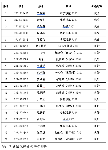 根据《西安交通大学“珠峰计划”(综改试验班)建设方案(试行)》(西交校发〔2024〕5号)规定,beat365正版唯一官网组织开展2024级 “珠峰计划”(综改试验班)学生考核工作。经学生个人总结、导师评价、现场答辩、专家评审等程序,5名学生考核结果为优秀,15名学生考核结果为良好,具体考核结果如下: