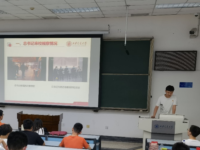 会议第二项,由支部第四党小组的吴弘毅同志带领大家重温习近平总书记来校考察重要讲话。他首先介绍了总书记来校视察的总体情况,带领同志们回顾总书记对交大的肯定和期望,并就总书记在交大的讲话引领同志们进行了更深层次的思考。此外,参会同志们也重温了交大西迁的时代背景和国际环境,对交大缘何西迁有了更加全面的认识。最后,吴弘毅同志呼吁大家在今后生活中牢记总书记嘱托、越是艰险越向前,不负总书记对交大的殷切期望。