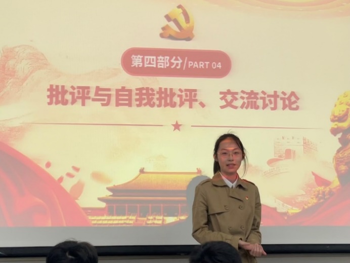 孙任君同志指出,自己和身边的部分同志存在着自我批评意识的缺失的问题,集中表现在批判性思维和辩证性思维的缺失上,体现在生活中对新消息、新知识反应思维迟钝中,即一味接受外界评价而缺少自己的独立思考。接着,她对刚刚结束的体质综合测试进行了反思,指出大多数同志在体质方面有了明显退步,而“身体是革命的本钱”,我们应当在日后的生活主动加强体育锻炼、提高身体素质。最后,她指出党员同志应当具有良好的精神面貌和较高的行动追求,党员在学习生活中更要不断激励自身,积极发挥模范带头作用。