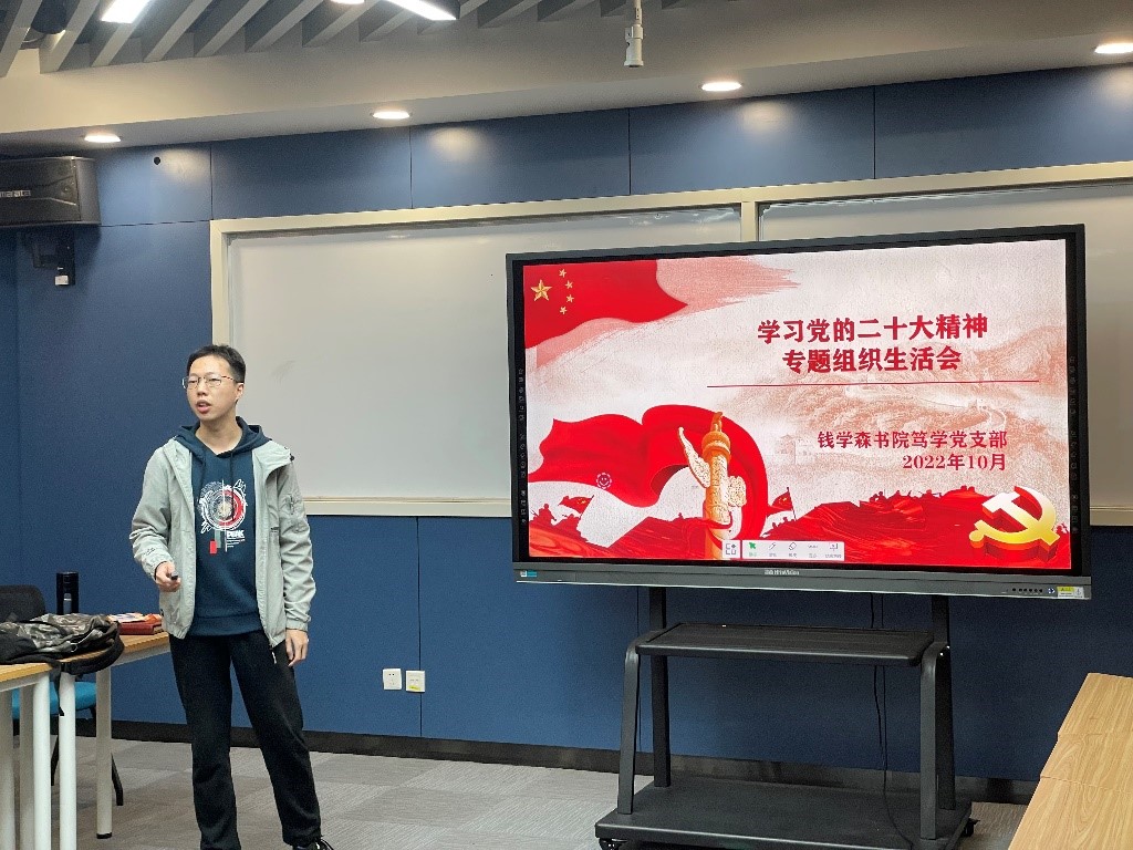 2022年10月30日晚,钱学森书院笃学党支部在仲英楼B917开展“学习党的二十大精神”专题组织生活会。会议由支部书记魏成骁主持,支部党员、积极分子参加。