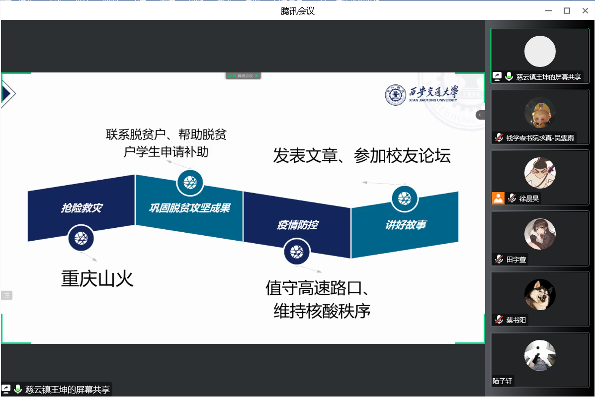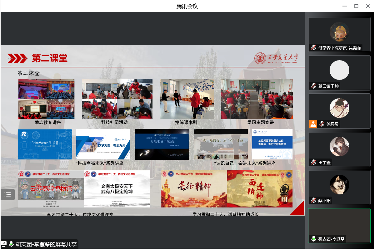 12月4日上午9时,钱学森书院党总支在线上举办党员建功基层论坛,邀请重庆选调生王坤和西安交通大学第二十四届研究生支教团成员李登辇分享他们“扎根祖国需要的地方服务人民、奉献青春”的故事。钱学森书院党总支委员、辅导员刘嘉淼以及各支部党员、积极分子参加,党总支委员徐晨昊主持活动。