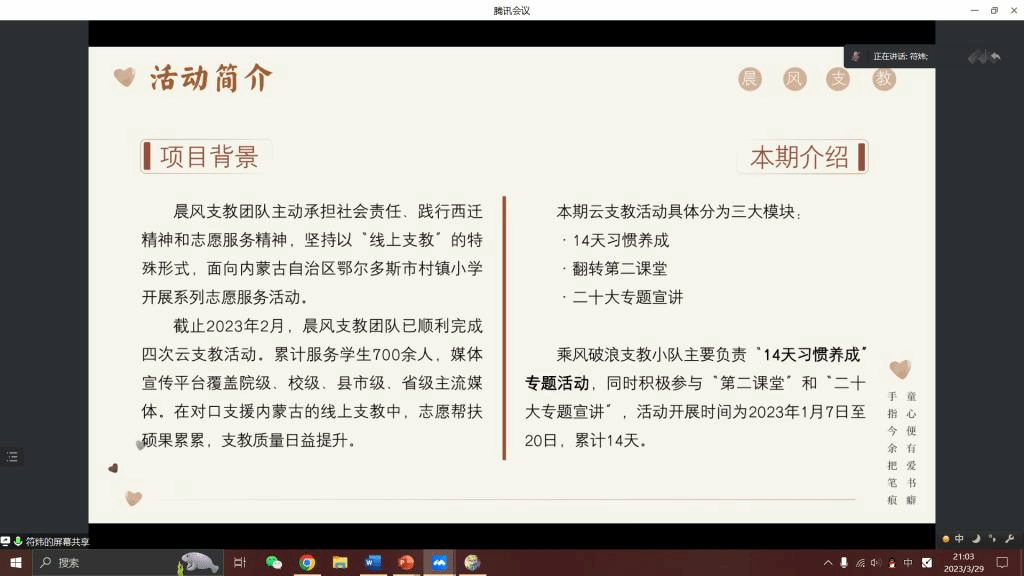 首先带来分享的是乘风破浪支教小队。在寒假期间,小队成员通过“线上支教”的形式面向内蒙古自治区鄂尔多斯市村镇小学开展系列活动。在本期云支教活动中,该小队主要负责和组织了“14天习惯养成”专题活动。
