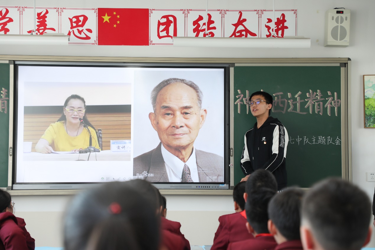 “回到久违多年的母校,虽然外表已经翻新,但亲切感犹存。从棕红色的老校区搬迁到大唐芙蓉园新址,看到曾经的老师,关爱学生和严谨治学的态度也一直留存发扬。就像今天我们讲述的西迁精神,薪火相传、历久弥新。我在环节中和同学们交流了关于西迁教授陈学俊的故事,孩子们清澈的眼神令我心中涌起一阵暖流。我真正感到,民族精神好像真的传达到了每个孩子心中,成为了每个人生活的底色。”