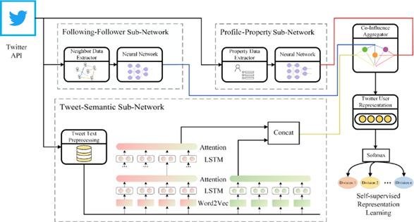 为了解决在新数据集上更加突出的两个问题,我们提出了一个基于自监督用户表示学习的模型SATAR,该模型通过自监督、运用多模态信息,综合考虑了语义、属性以及邻居的信息,并且提出共影响力的结构将这些信息聚合起来,达到了目前最好结果,该成果被CIKM2021接收。为了进一步探索图结构的作用,我们提出了使用异质关系网络模型RGCN,通过异质图卷积网络,让模型能够理解图结构的不同,该成果被ASONAM2021接收。暑假期间,我参加了NUS的暑期项目,进一步探讨了对比学习在社交机器人检测中的应用,该项目获得了亚军,我个人则获得了A评级。