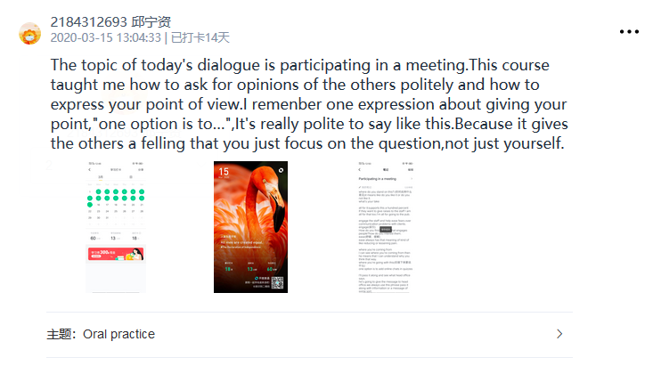 2020是有挑战的一年,新型冠状肺炎来势汹汹,万千学子足不出户,但华罗庚说过“在寻求真理的长河中,唯有学习,不断地学习,勤奋地学习,有创造性地学习,才能越重山跨峻岭。”英语学习亦不能止步不前。为了鼓励同学们在家坚持学习英语,钱学森书院开展了“Daily English”线上打卡活动,同学们每天在“小打卡”小程序打卡,分享自己英语学习的内容,涵盖听、说、读、写四个方面,并用英文发表自己对当日所学内容的理解、感想或总结。