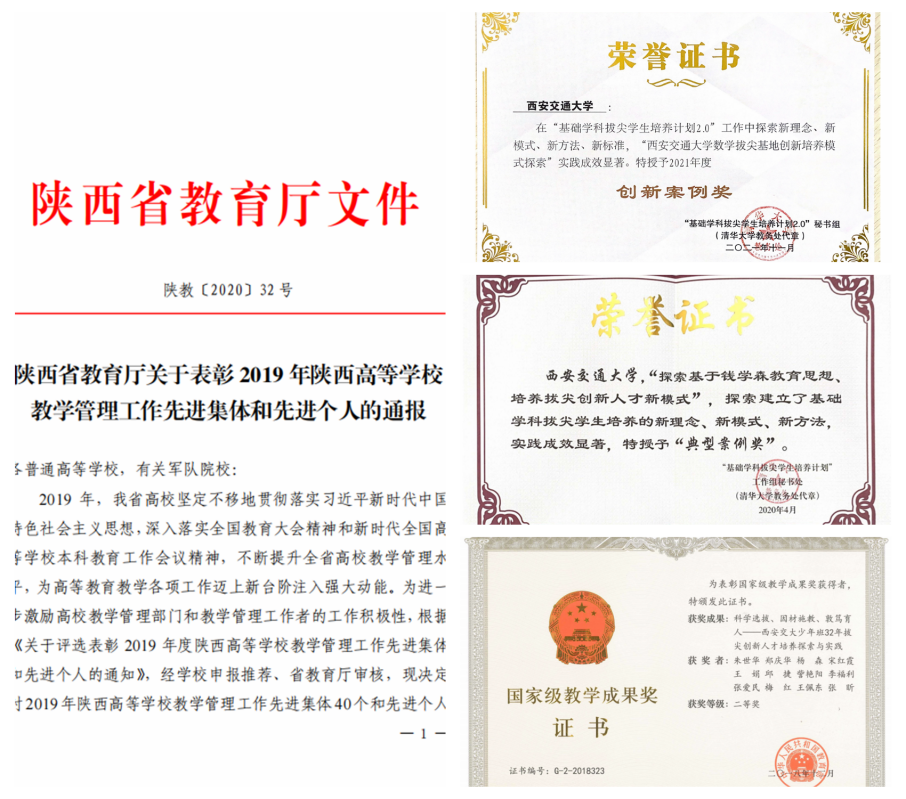 西安交通大学从体制机制改革、选拔体系完善、培养模式创新等方面开展实践的同时,深入实施导师制,重视教学质量监控。通过校内培育与校外聘邀相结合保障师资水平,实现大师引领,依托学校教育教学质量实时监测大数据平台,打造“四精课堂”。2009年至今试验班已毕业389人,继续深造率99%,部分毕业生赴哈佛大学、麻省理工学院、普林斯顿大学等知名学府继续深造,一批高水平成果陆续在Nature、Science等顶级期刊发表,优秀学子获“全国向上向善好青年——勤学上进好青年”“阿里巴巴全球数学竞赛金奖”等荣誉。拔尖创新人才培养改革不仅带动了全校教改创新实践,还得到教育界和社会的普遍认可。