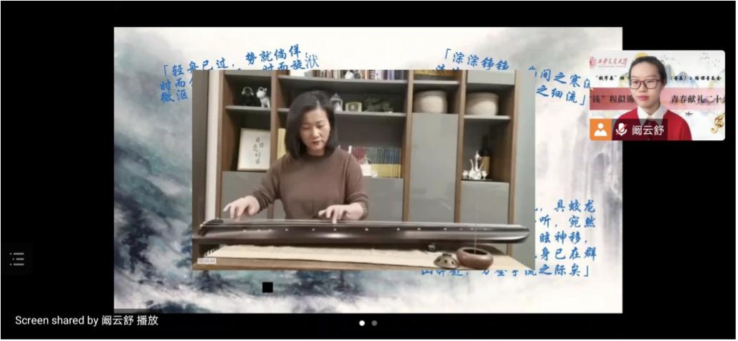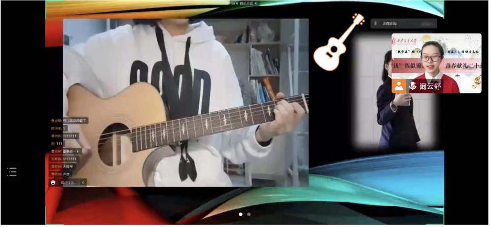 “云”音乐会由来自智造钱2201的阚云舒同学主持,她为线上音乐会的顺利举行做了很多准备工作。开场时,课程负责人曹耿献老师对同学们的付出和努力表示衷心感谢,她说:“正因为在疫情中大家“青春的热情”才能够点燃线上的“云”音乐会,《艺术欣赏与创作(音乐)》同学们的风采也才能呈现给所有的观众们。”