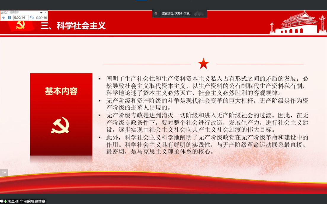 首先,求真党支部的叶宇辰同志带领大家学习了马克思主义基本理论。他分别介绍了唯物论和辩证法、政治经济学和科学社会主义等三个马克思主义理论的核心内容,为大家梳理了马克思主义理论的基本框架,加强了党员同志们的基本理论素养。