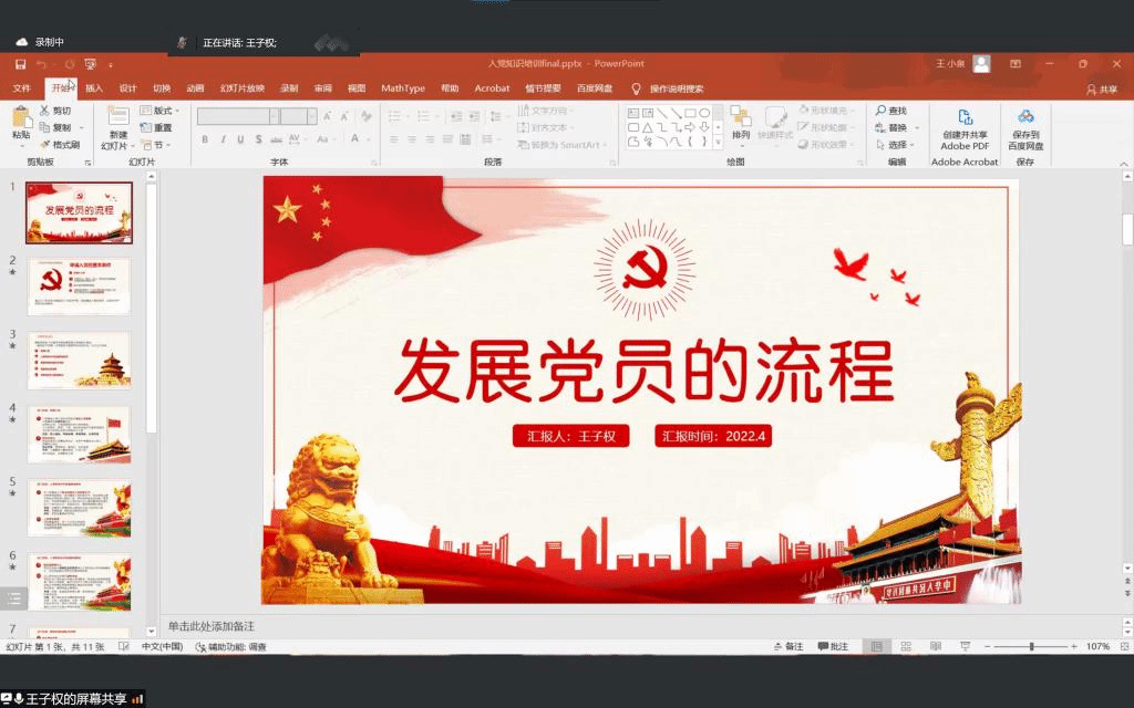 随后,笃学党支部第二小组的王子权和张明岩同志分别介绍了党务知识,包括发展党员的流程以及组织生活的介绍。王子权同志在介绍发展党员的流程中提到了五个关键过程:入党申请书的提交;入党积极分子的培养和教育;发展对象的确定和考察;预备党员的接受和预备党员的考察和转正。张明岩同志向大家介绍了组织生活的“三会一课”制度,让大家对于党务知识有了基本的了解。