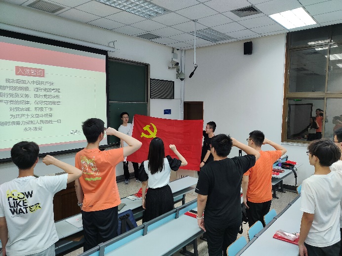 会议第一项,全体党员起立,面对党旗重做庄严的入党宣誓。