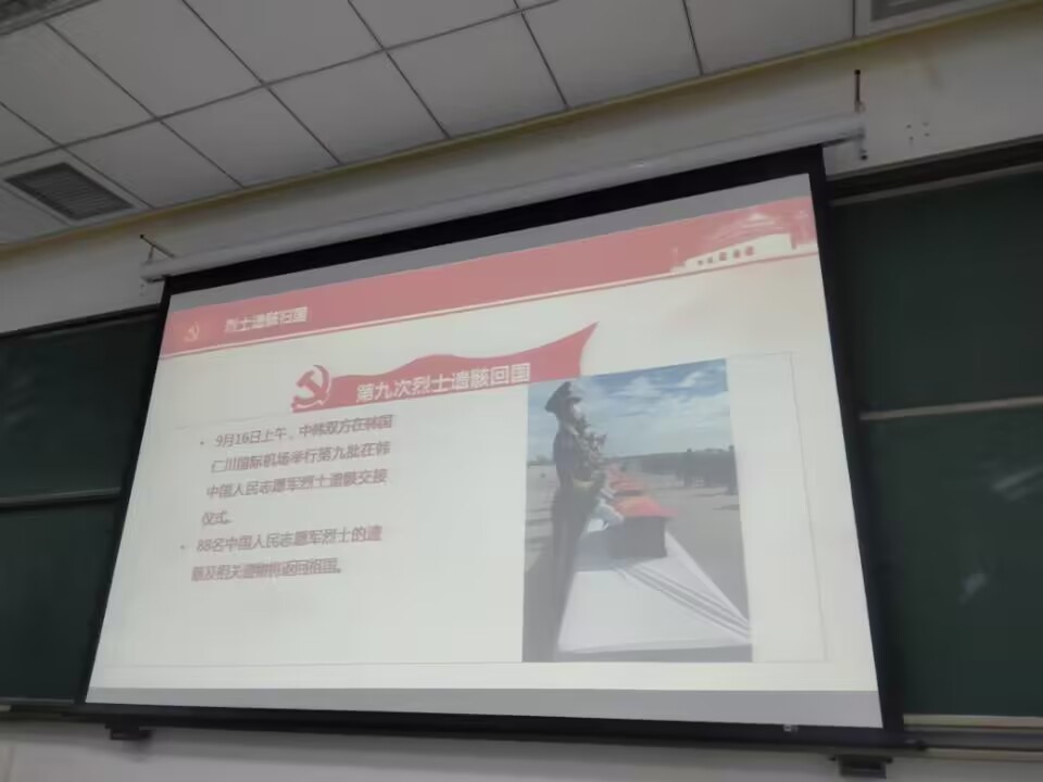 会议第三项,支部成员学习了近期时事:“第九次烈士遗骸回国”。9月16日上午,中韩双方在韩国仁川国际机场举行第九批在韩中国人民志愿军烈士遗骸交接仪式,88名中国人民志愿军烈士的遗骸及相关遗物将返回祖国。高浩田同志指出,抗美援朝战争在维护新中国与世界的和平中具有重要意义,我们要铭记烈士们的事迹,学习他们不怕牺牲、甘于奉献精神,在新时代征程中贡献自己的力量。