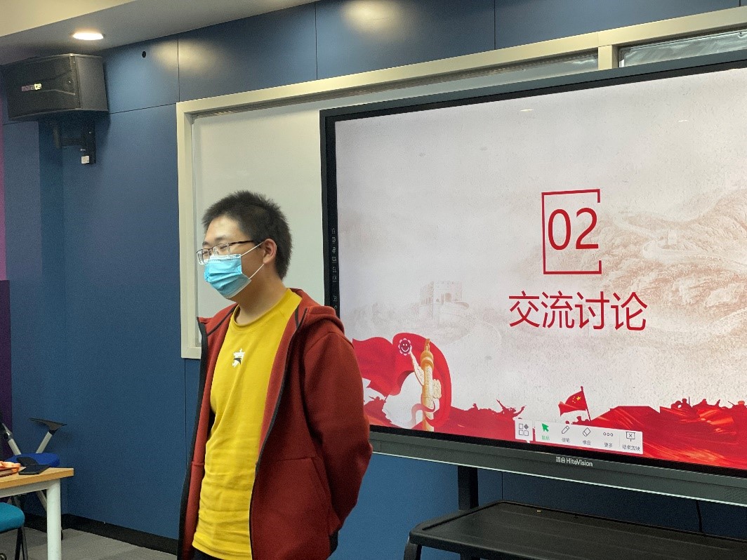第一党小组的陶书轩同志分享了自己对二十大报告中关于台湾问题的感想。该同志从佩洛西窜访台湾事件讲起,他从二十大报告中看出,中国人有能力且必须捍卫祖国统一。该同志坚信,在中国共产党的领导下,祖国统一一定能够实现。