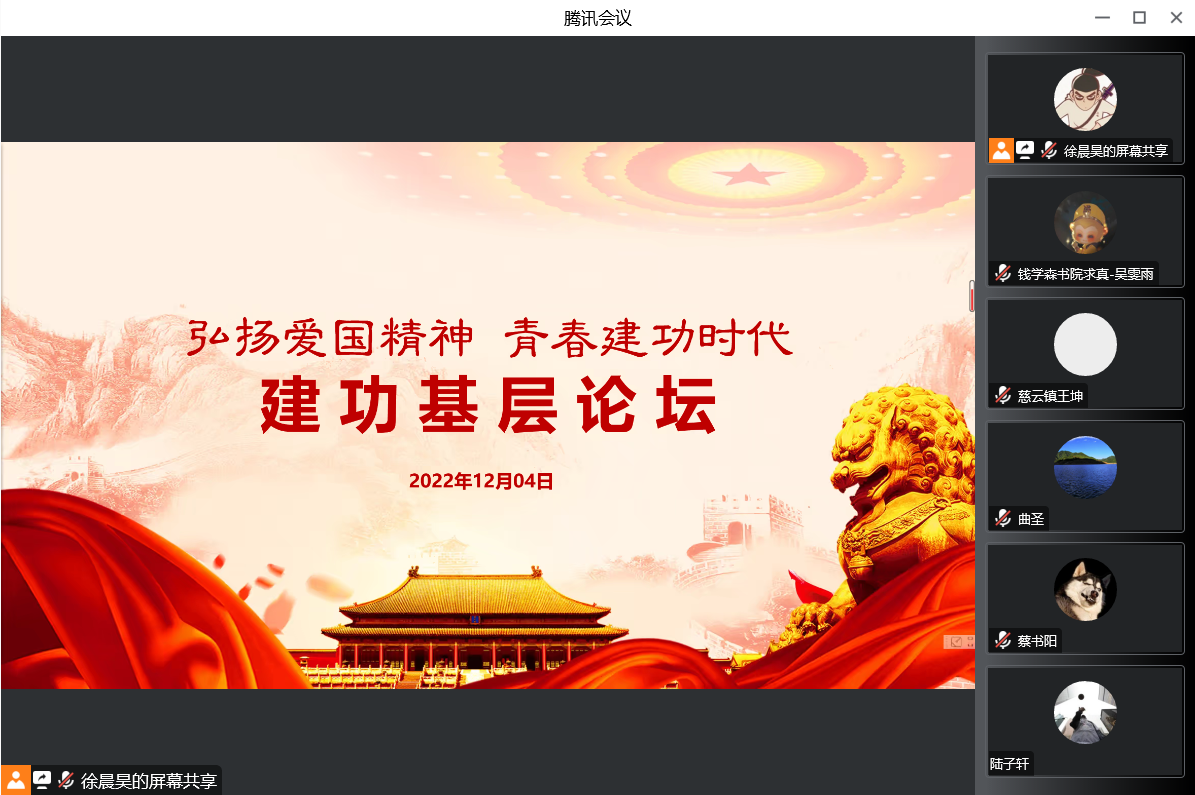 12月4日上午9时,钱学森书院党总支在线上举办党员建功基层论坛,邀请重庆选调生王坤和西安交通大学第二十四届研究生支教团成员李登辇分享他们“扎根祖国需要的地方服务人民、奉献青春”的故事。钱学森书院党总支委员、辅导员刘嘉淼以及各支部党员、积极分子参加,党总支委员徐晨昊主持活动。