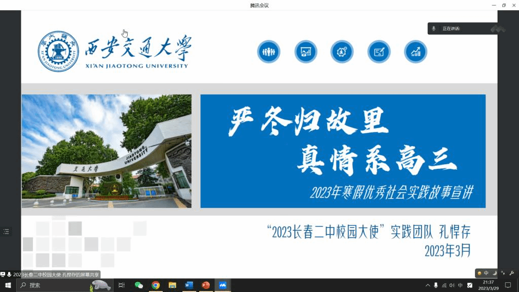 “2023长春二中校园大使”实践团队面向长春二中,向同学们介绍交大、推荐交大。团队通过线上组织联合宣讲和答疑解惑,为长春二中和长春市文理高中的同学们详细介绍了交大情况,缓解了高中同学们网课期间的枯燥和焦虑,并为交大招生寻找了潜在生源。孔悍存同学在分享中提到,在活动开始之际团队就遭遇了许多难题:一方面疫情政策调整,许多同学感染新冠;另一方面疫情防控政策限制了线下宣讲。团队提出的解决方法是同其他高校组织联合宣讲,并通过建立宣讲群方式为学弟学妹们在线答疑解惑,取得了良好的效果。