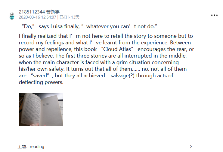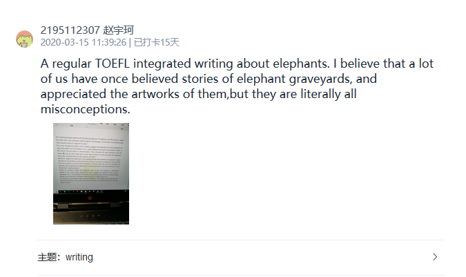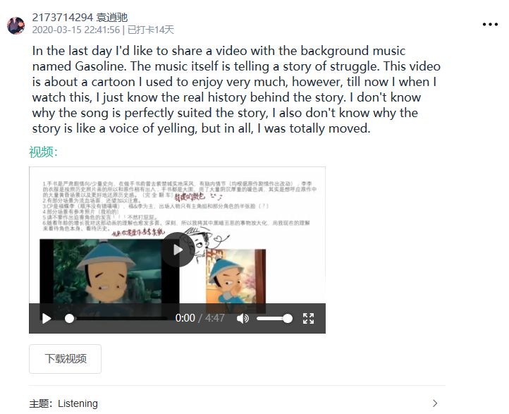 2020是有挑战的一年,新型冠状肺炎来势汹汹,万千学子足不出户,但华罗庚说过“在寻求真理的长河中,唯有学习,不断地学习,勤奋地学习,有创造性地学习,才能越重山跨峻岭。”英语学习亦不能止步不前。为了鼓励同学们在家坚持学习英语,钱学森书院开展了“Daily English”线上打卡活动,同学们每天在“小打卡”小程序打卡,分享自己英语学习的内容,涵盖听、说、读、写四个方面,并用英文发表自己对当日所学内容的理解、感想或总结。
